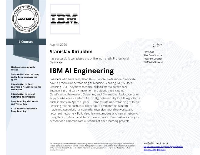 The IBM AI Engineering Professional Certificate on Coursera consists of six courses: